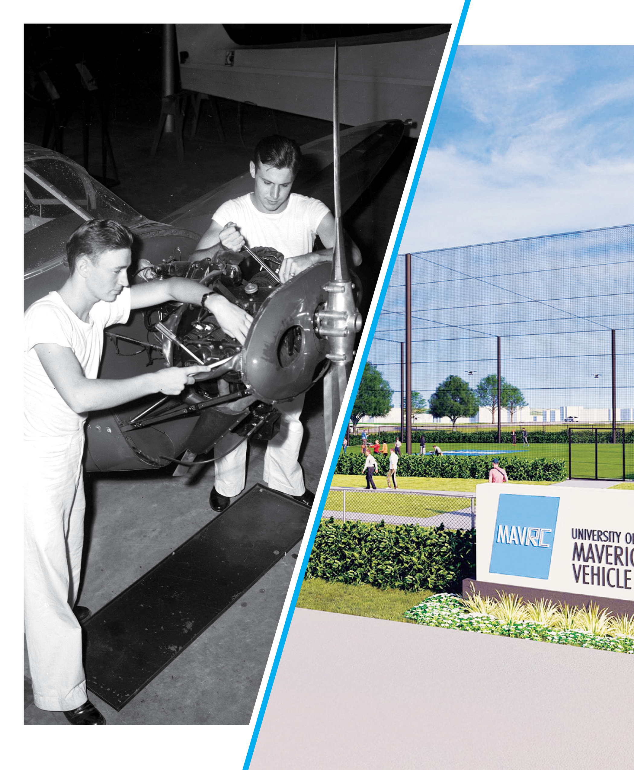 Photo caption: From wartime aircraft work by North Texas Agricultural College students in the 1940s to cutting-edge unmanned aircraft research today, Mavericks continue to soar.