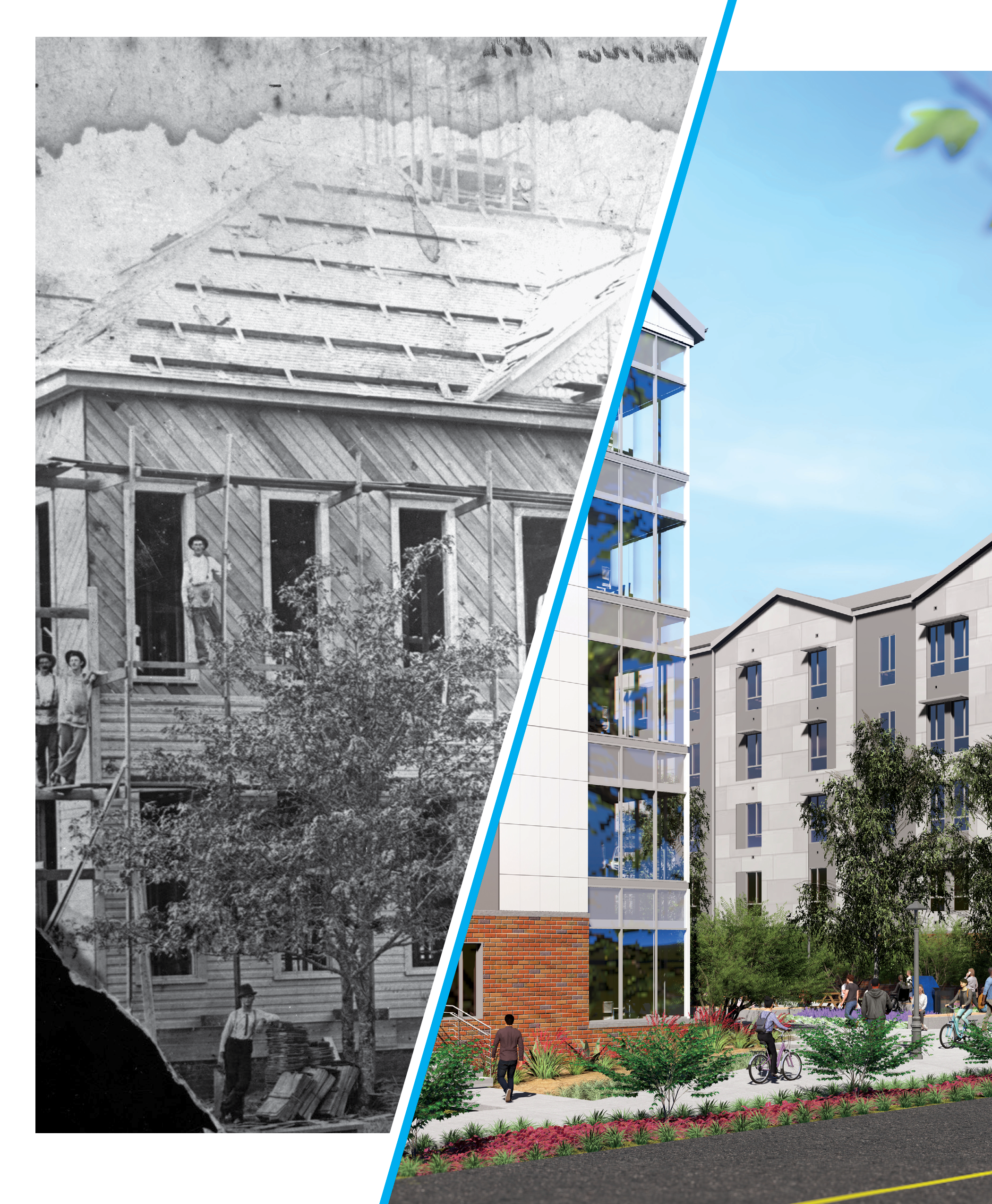 Photo caption: Fish Hall rose in 1895 as UTA’s first building; Maverick Hall, the newest, is set to open in fall 2025.
