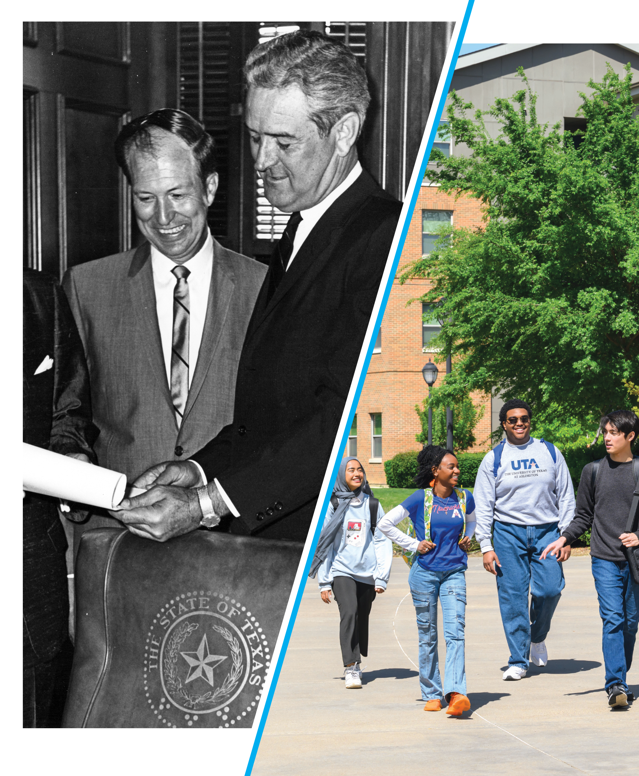 Photo caption: Gov. John Connally (dark suit) signed the bill bringing Arlington State College to the UT System in 1965—paving the way for UTA’s continued commitment to student success.